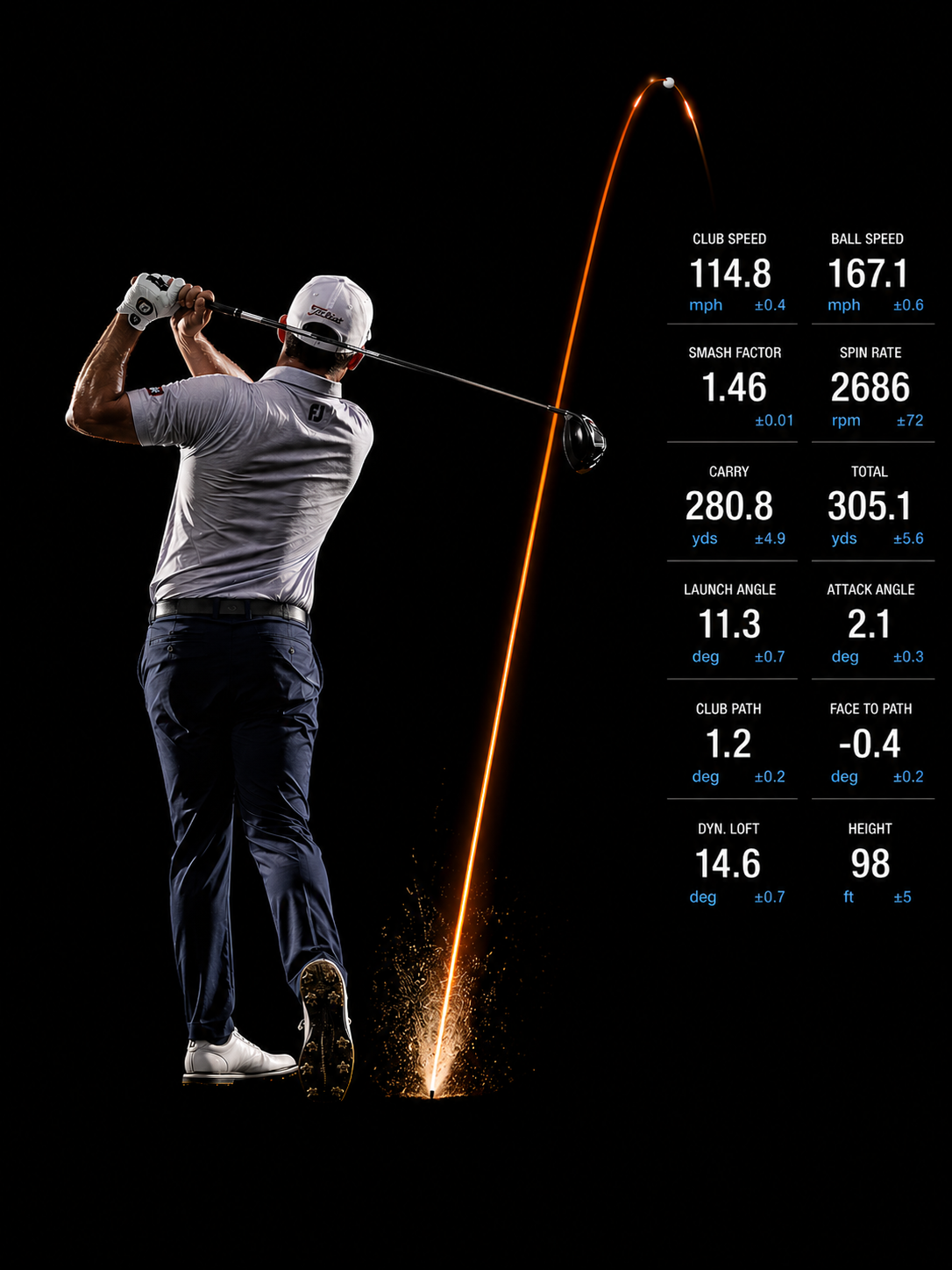 Club speed & ball speed These two together give you your smash factor (ball speed ÷ club speed). A smash factor of 1.48 or above with a driver means you're making solid, centred contact. If your ball speed is low relative to your club speed, you're leaking energy somewhere - usually off-centre strikes.